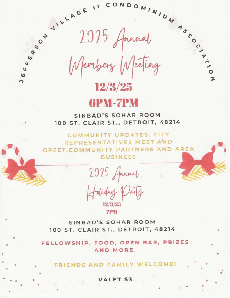 Meeting will be held on Wednesday, December 3rd at Sinbad’s Sohar Room. Sinbad’s is located at 100 St. Clair St., Detroit, MI 48214. The Membership meeting begins at 6pm. The Holiday party begins at 7pm. We look forward to seeing you there.